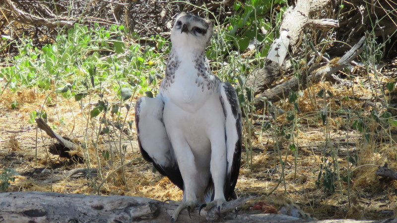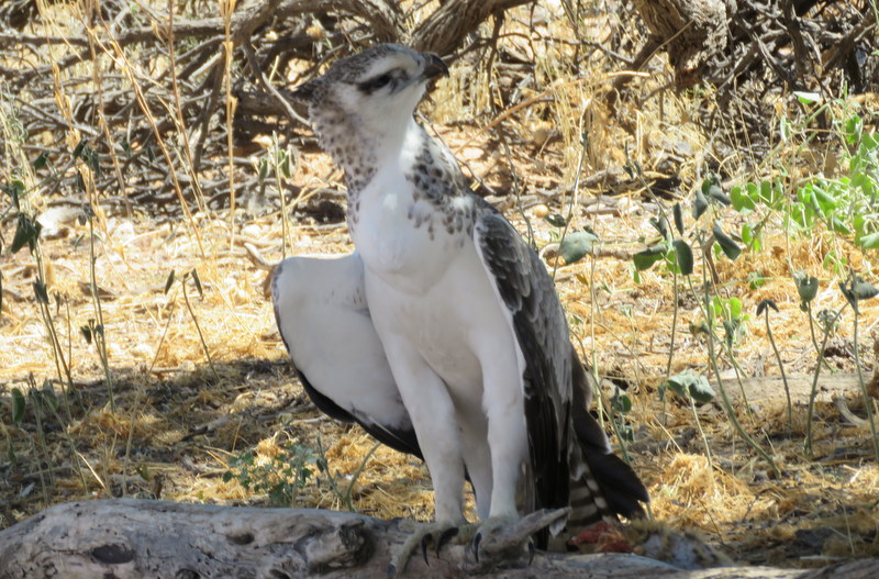 We almost missed an immature martial eagle on a log on the ground.  Pat called – Ooohh what was that?  The Earl screeched to a halt and rapidly reversed. He was quite content to let us stare at him and take some photos.