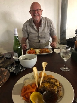 There is a small shop with limited supplies on the premises. The restaurant is lovely. You can sit on the patio outside and enjoy panoramic views across the valley. The food too is inexpensive and of excellent quality. This evening we dined there. The Earl had Lasagna and I had Bobotie both served with the most delicious vegetables. We also had a bottle of sauvignon blanc The total cost of the meal was R270. That would be €14 or £ 12.70 or $16,60. That’s hard to beat even in other places in South Africa.