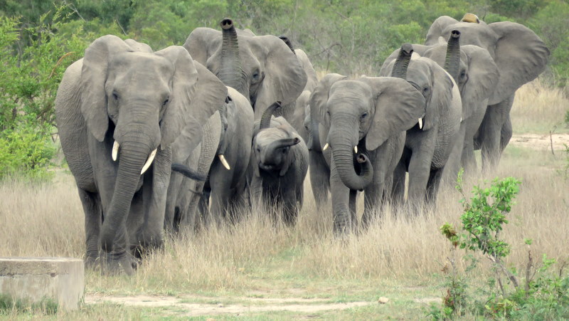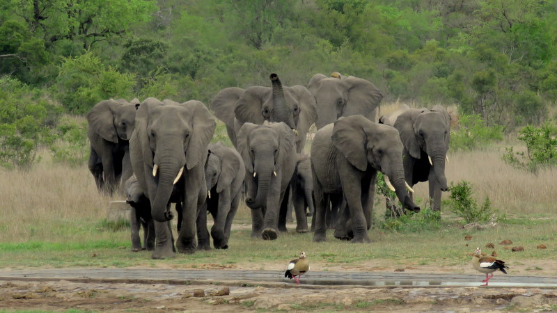 As we approached Kwagga Waterhole we saw an Egyptian geese and were going to just drive on when the Earl said, “Elephant approaching” and there in the distance a whole troop, with trunks in the air came lolloping down for a drink.