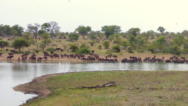 At first we are unaware of the liberation and are surprised to see a large herd of zebra and wildebeest making their way to N’wanetsi Dam on the Orpen Road. We go to the dam to wait for their arrival and find three buffalo in the water – not exactly a large herd but wait – a little later this changes!
