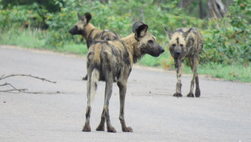 Isn’t it strange how the brain works, “Wild Dog,” came out of my mouth before I actually realised what I’d seen. They were facing in the opposite direction to where we needed to go but we could see them beautifully from the stop sign. They hung around until they were all ready to trot off.