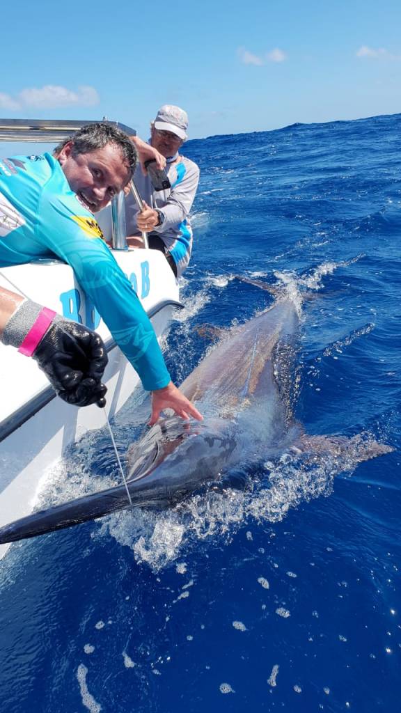 Well done to Robin Vermaak on Lyfie who at 11h20 released a 120 kg black marlin caught on live bait. Position 07/57. At 13:17 Lyfie had another on/off. 13:36 Kinda Magic had an on/off too. At 14h08 Lyfie was once again vas on a marlin. They saw that it was a huge black, called for colour (pink) and then at 15h06 they successfully released a 2.72m estimated at 280 kg black marlin. The angler responsible for this was Louis Langeman.