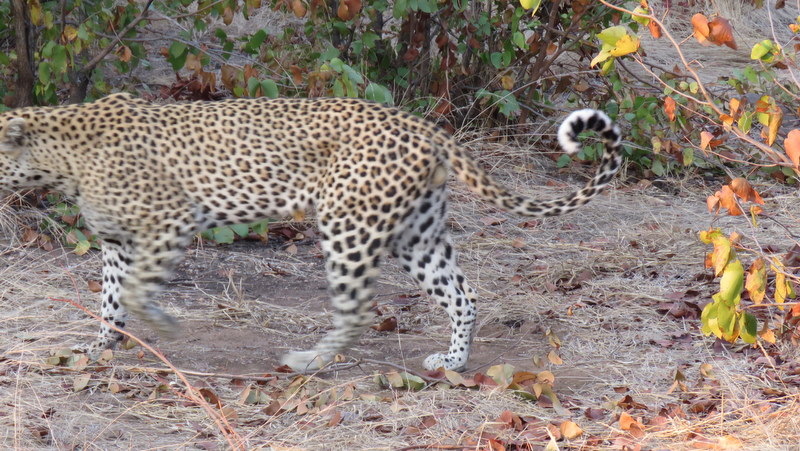 “He’s gone, hasn’t he?” I said. Cathy was in the driver’s seat. “Yes,” she replied. “I noticed something coming toward us and said to Alec – It’s a leopard! I stopped and snapped a shot through the windscreen. Then she walked to Alec’s side of the car and he took the camera but in his excitement didn’t get the whole animal in!” She laughed.