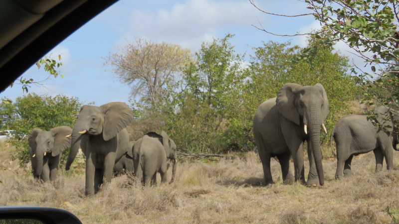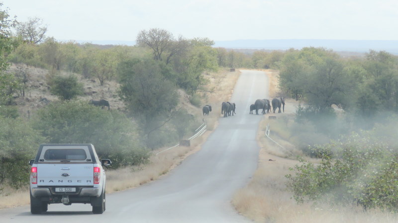 We’re letting all the elephants cross over but they’re heading down the road we want to take. And they’ve got babies. It’s wise to give them a wide berth as they’re very protective of their young. Let’s just go very carefully down that road and hope they’re not blocking it.