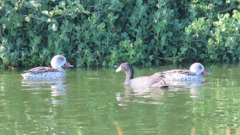 Cape Teal and Red-knobbed Coot greeting each other