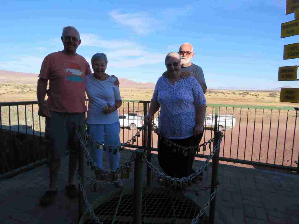 We were sorry to leave At Kronenhof Lodge. Campsite #4 was a wonderful place to stay and we were sad to be packing up for our trip to Sesriem. Before we left, however, we joined the At Kronenhof Lodge Friendship Chain. At the lodge, you get a padlock, and they have a fine Dremel tool that you use to engrave something onto the lock. We engraved our names and Gecko 109. The lock is then placed on the chain and you keep one key, your partner the second and the third is thrown into a pit below the chain. Now your friendship is locked in place. What a great tradition!