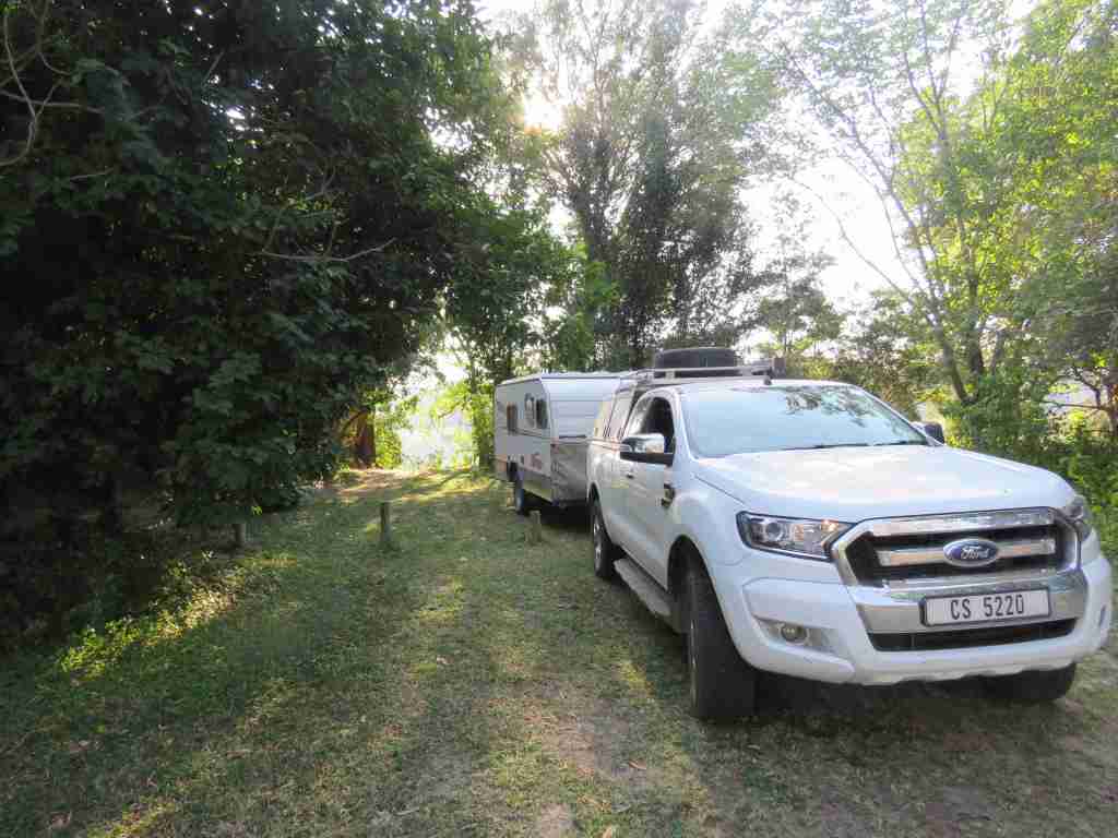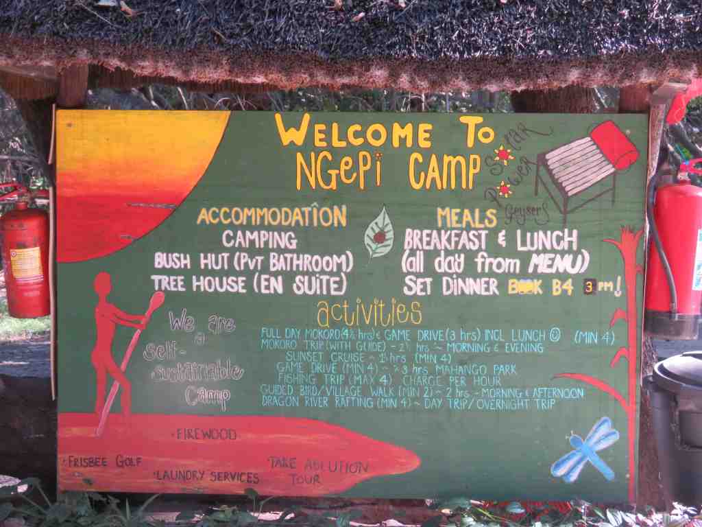 We turned into the access road to Ngepi, with no idea of how bad these four kilometers would be. Not only are there parts thick with sand, but there are also dips, bumps and rocks to contend with along with the usual dogs, kids, cows, goats and donkeys! We had to smile at the signboard that said “About halfway” after almost two kilometers. We eventually arrived at the reception desk and were allocated campsites 16 and 17.