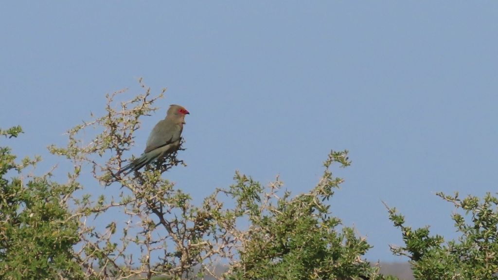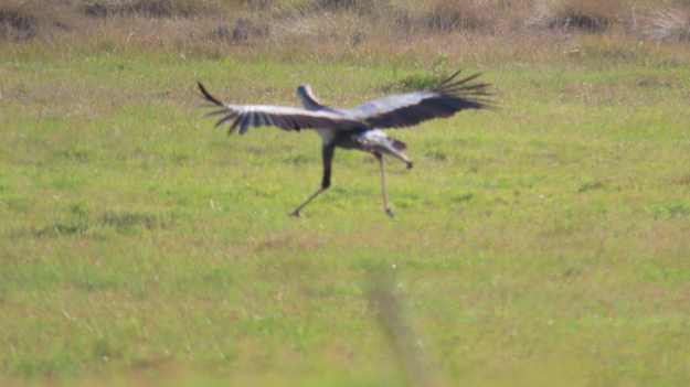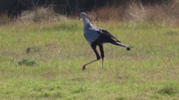 I really wanted to see a secretary bird and a Denham’s Bustard. The latter was a real possibility as these birds are quite common in the area but they must have been away for the weekend. However, just as we were resigning ourselves to the fact that no more species would be added to the list, a big bird dropped from the sky, landed in the field next to the car and took off at a run! It was a secretary bird. We almost fell out of the vehicle in surprise and I only just managed to get two very poor photographs!