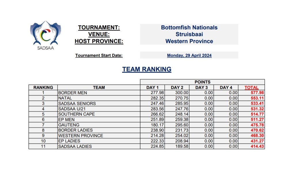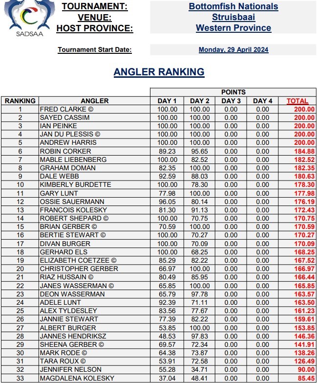 In the Ladies’ Bottom Fish Nationals Section, Bronze was presented to SADSAA, Silver to Eastern Province, and Gold to Border. Mable Liebenberg was the top lady angler in the National Ladies’ division.