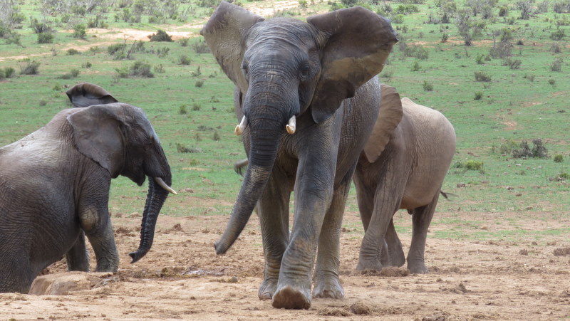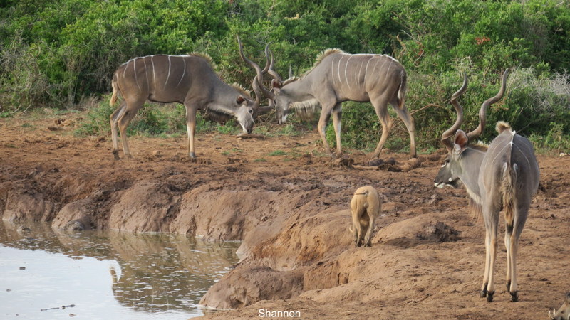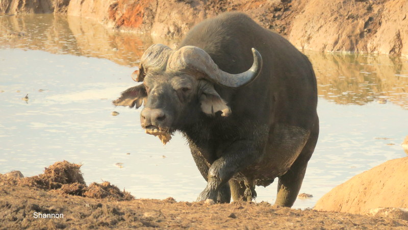 Simon spotted the ellies marching to the pond first then called – hey – there’s also a rhino! We must have just missed it taking a drink as it was heading back to the thickets.