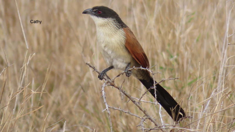 Our first Burchell’s Coucal of the day. Several of his friends turned up to say hello during the course of our driveThis sleepyhead would not look at usSo Cathy took a close-upThis usually shy steenbok is not afraid of anyoneUh oh, Road BlockKeeping company with the stripy onesCathy’s nick-name for giraffe – “Raafies”These leaves are deliciousA call from Alec on the walkie talkie alerted us to a big surpriseThis guy has huge tusksI want to be a tusker!A Tawny Eagle posed obliginglyA juvenile bateleur enjoying a mealHe gave the Earl a hard stareLots of elephants on the S100Don’t worry, I won’t chase you todayWildebeest were on the march
