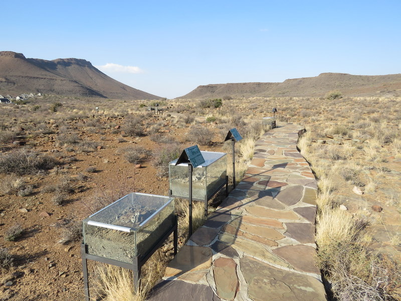 I also detoured to a wonderful fossil trail which would delight anybody interested in paleontology. The Karoo is very rich in fossils of terrestrial animals from the Permian and Triassic geological periods. The 300m paved trail, has collections of fossilized creatures in glass cabinets each having a signboard explaining its exhibit.