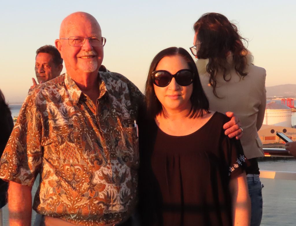 Goodbye Table Mountain – Note the FNB Portside Building on the extreme right – where Lisa and Laurie workAn exciting experience for JoshWendy, Lauren, Jay, Joshua, Laurie, Earl, and Lisa – ready to go down for our first on-board dinnerThe Fab Four ready for Fun!My grandsons and me – I used to hold one on each hip – Look at them now!Me and Laurie – as the ship leaves portEarl and Lollz