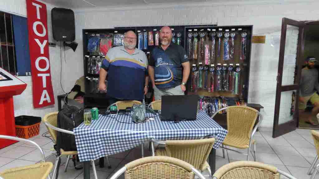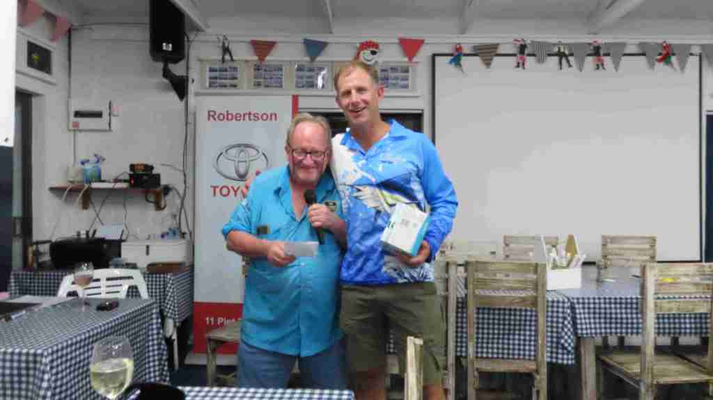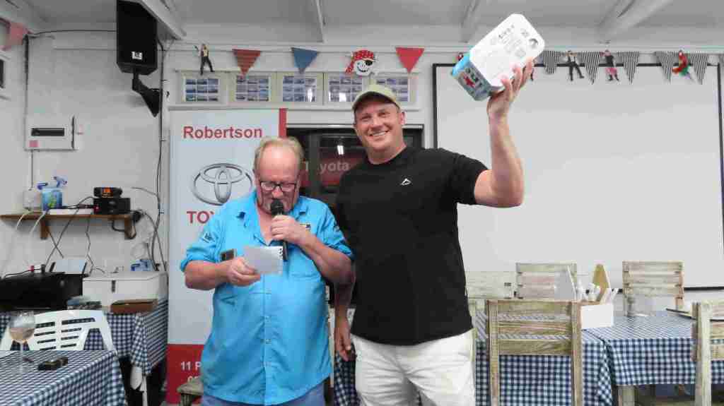 Trevor Brinch (Spotter One) and Andrew Perrins (Marlin Control) were presented with gifts for manning the radios throughout the tournament – This year’s organiser, Grant van der Westhuyzen on the right