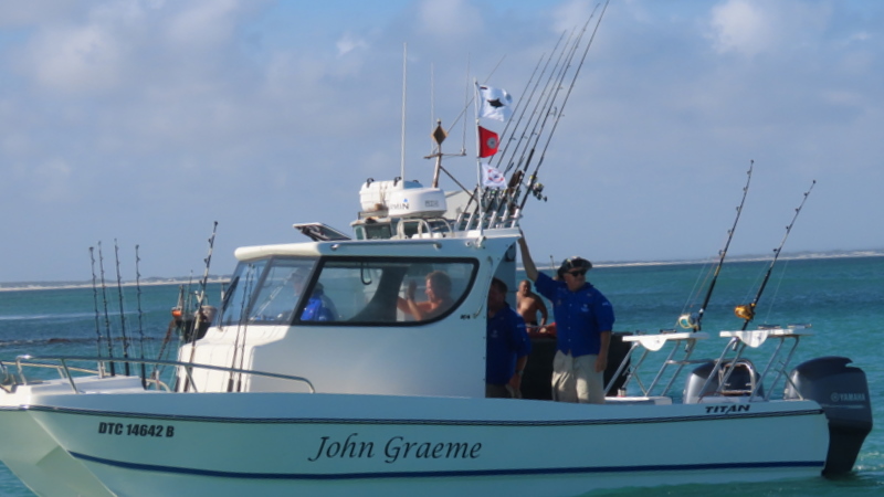 The John Graeme crew have always been generous with their advice. Knowing that we needed to boat this fish to get back pole position we all set about our jobs working hand in hand with our very able and calm skipper Chris. We tried to subdue a fish that was having none of it. Spending more time in the air than in the water this majestic beast tried every trick in the book to throw the hook. At times I had brief thoughts about being the guy who lost the fish. During this epic battle, and knowing the fleet was listening closely, we finally got hands on the leader and brought the fish alongside. As we were getting ready to bill and measure, the line parted, allowing the fish to swim away strongly back to freedom.