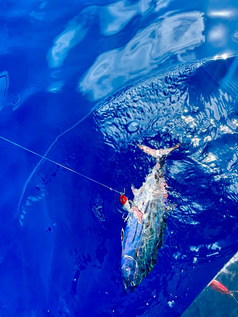 Fifteen minutes after setting our baits the ratchet on the starboard reel brought us all back into focus. No sooner had it started than it abruptly stopped. As the realisation of this lost opportunity sank in, silence befell the crew. Fortunately, this didn’t last as a portside rig exploded into life and brought us all back to our senses.