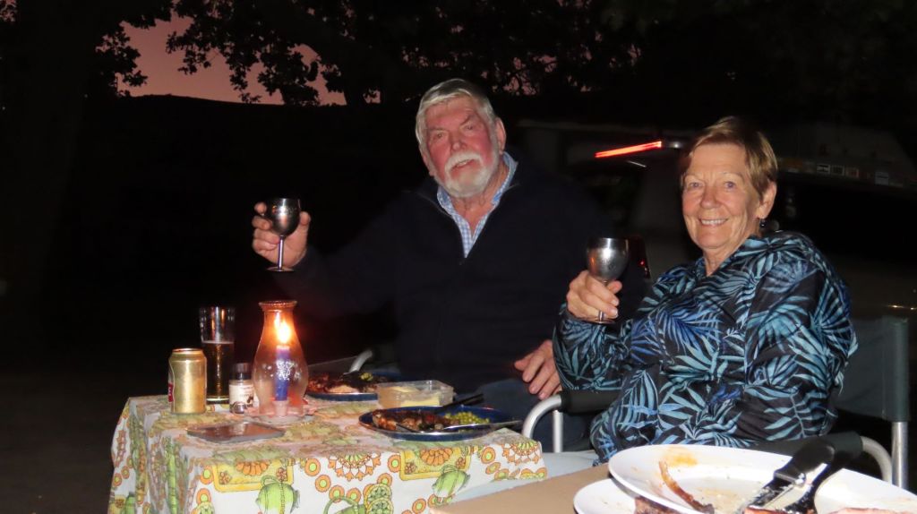 Pottie enjoying a broodjieJohn and Jane keep up their standards with candles, tablecloth and fancy goblets.Left to right – Cathy, Helen, Colin, Diane, Karen, Johnny, VictorLeft to right – Coin Diane, Karen, Johnny, Victor, Maria, Susann, GeorgeSusann and George clearly enjoying the fun – Maria on the left
