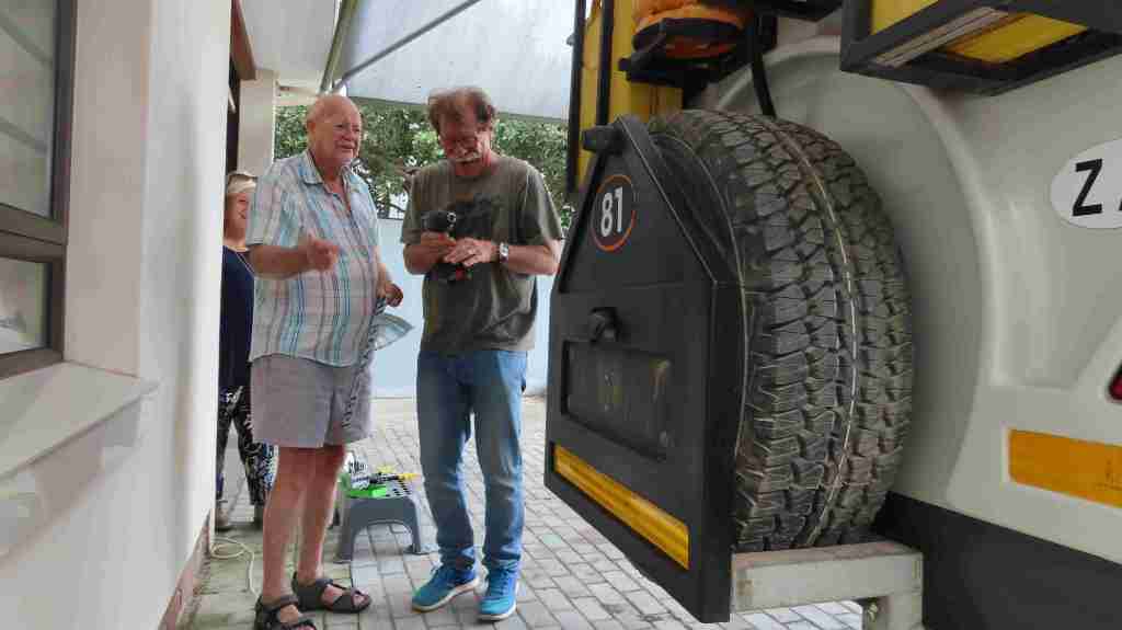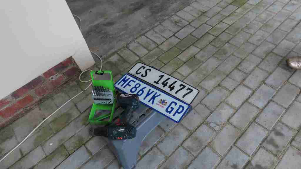CS plate off Gauteng plate about to be put onDiscussing the procedureEben at workQuality controller We were gifted with fire-lighters made by EbenThe handover – Champers and a card from us to themGoodbye Gecko – – Eben and Mara may you have many fabulous adventures with Geitjie